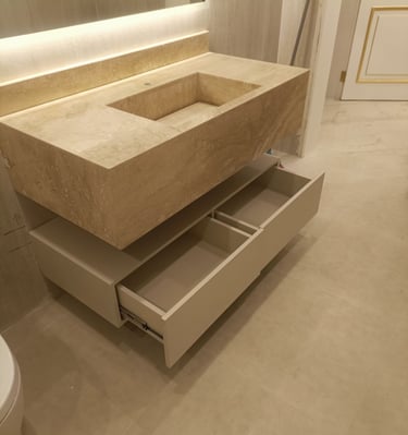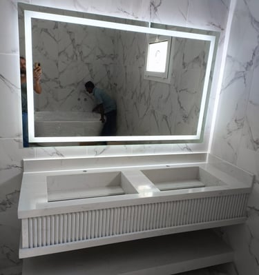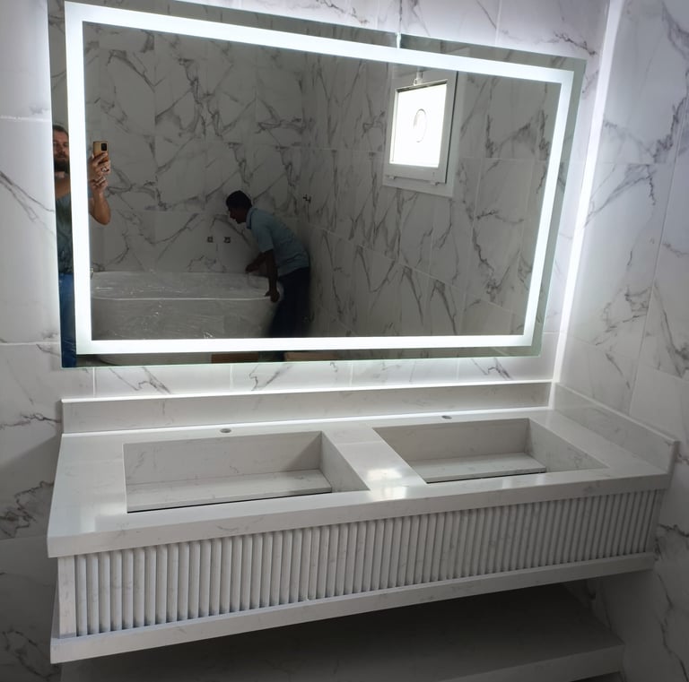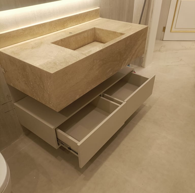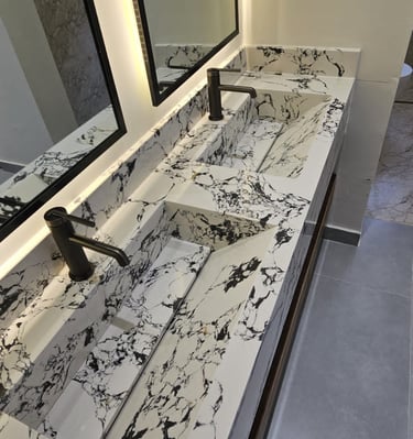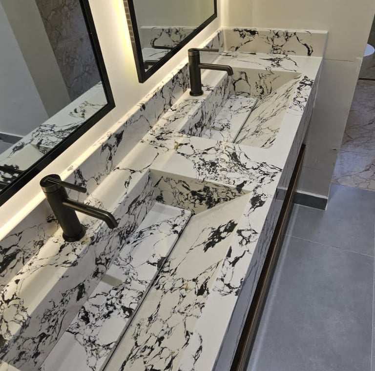 إن تميزنا في F-MARBLE ينبع من اهتمامنا بأدق التفاصيل التقنية والجمالية؛ فنحن نمتلك فريقاً محترفاً متخصصاً في تفصيل رخام المطابخ والحمامات والمغاسل، مع الالتزام التام بتنفيذ تصاميم "البوك ماتش" (Book-match) التي تبرز جمال العروق الطبيعية وانسيابيتها. كما نحرص على تطبيق أحدث معايير الجودة في تركيب أرضيات وجدران الرخام لضمان المتانة والمظهر الخلاب الذي يدوم لسنوات طويلة، متجاوزين بذلك التوقعات التقليدية في سوق الرخام والديكور.